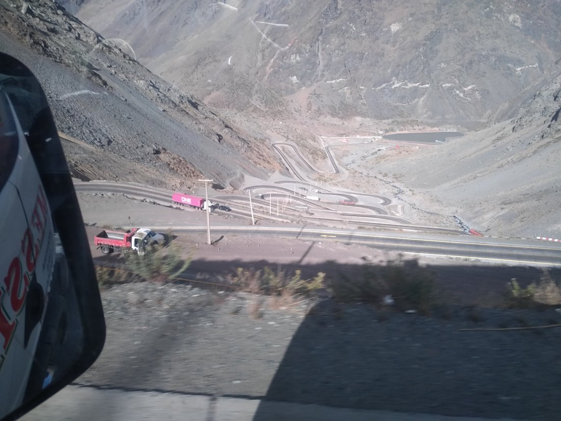 Pascal tend le pouce au 1er camion, et nous voilà repartis. Descente du col et de ses 32 virages dans un camion qui fait la liaison Buenos aires – Santiago depuis 15 ans.