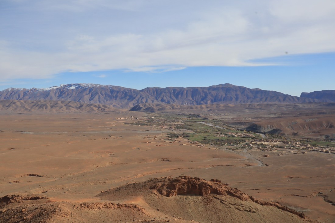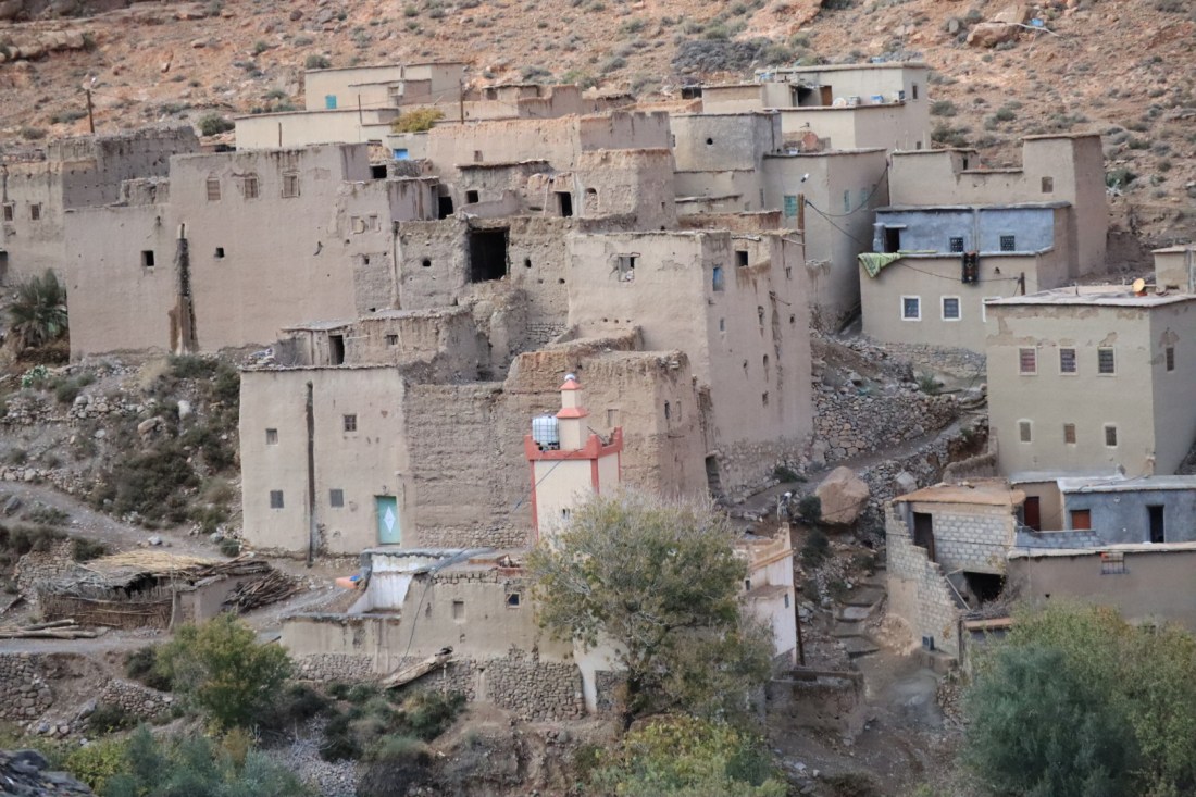 Amellago, situé à l’est de Taghia, de l’autre côté des montagnes. Village berbère du haut Atlas, où les maisons en terre longent la route et les champs, la rivière.