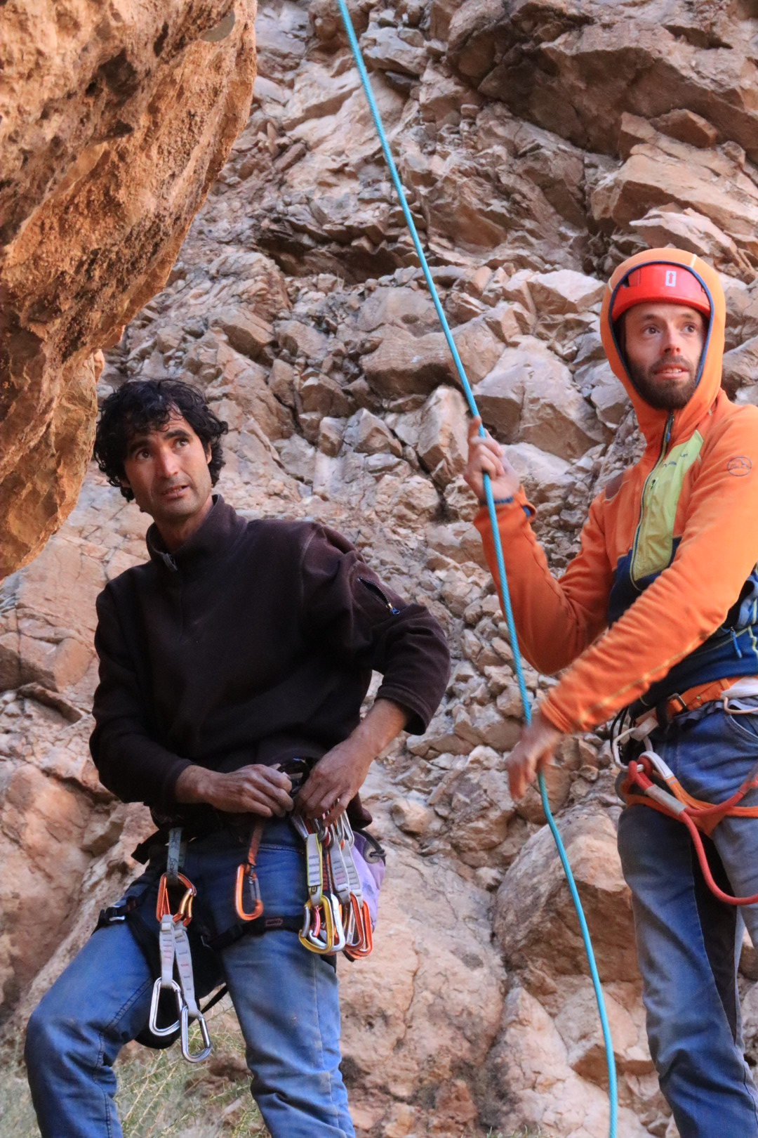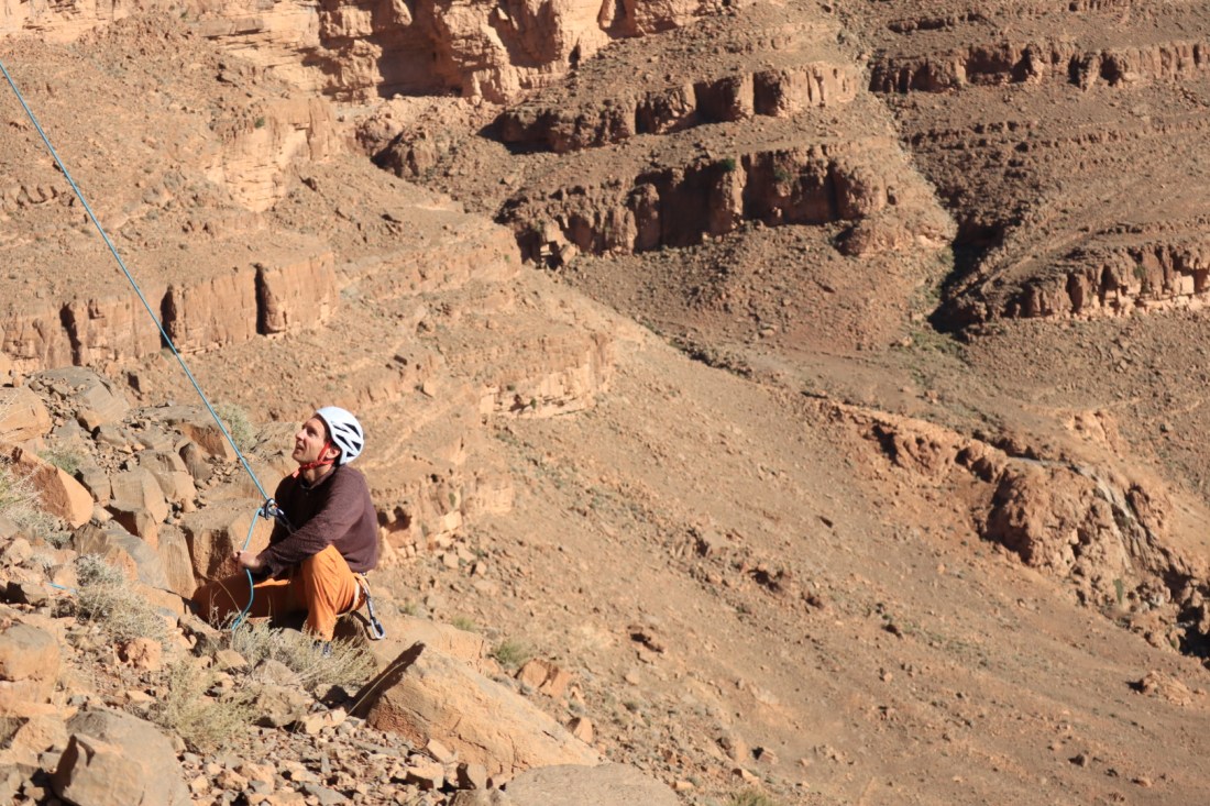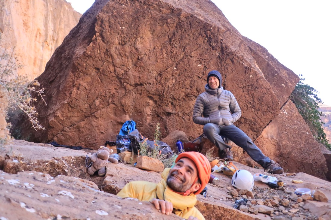 Le rire de Mimoun résonne encore dans nos têtes pendant les parties de UNO endiablées. Mimoun, c’est le premier équipeur du lieu. Mimoun, il est rempli d’envies pour ce lieu, ces montagnes. Son projet pour 2020, c’est un nouveau gîte au pied de la montagne, auquel il ne reste plus que le toit à installer. Mimoun, c’est le topo vivant du site. Pas de topo écrit, c’est lui qui connaît les voies et les secteurs par cœur. Grâce à lui, on s’arme de patience et on découvre chaque jour des falaises différentes. Mimoun, il nous a accueilli comme des rois, pris soin de chacun de nous, nous a accompagné sur les voies. Mimoun, ce fut une belle rencontre humaine. Merci à lui pour ces dix belles journées, où petit à petit,en découvrant les lieux, on s’est dit que oui, il y a un beau potentiel ici à développer, casque sur la tête. Où il n’y a pas besoin d’une piscine pour juste apprécier être là.